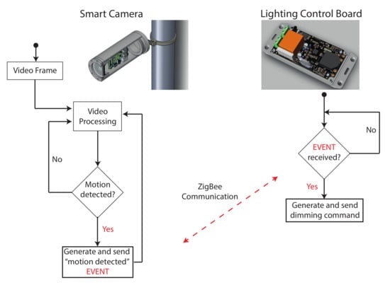 The lighting control system is in charge to adjust the lamps brightness in real-time on the basis of daily time and traffic intensity and classification so that the power consumption is minimized and proper lighting levels are always guaranteed in every traffic and weather condition. The control system mainly exploits two electronic devices (Smart Camera and Lighting Control Board) and a network link between them. Figure 5 shows the lighting control procedure and the basic idea in the interaction between the smart camera and the lighting control board. Both devices have been designed, assembled and properly customized for our smart lighting application and equipped with a ZigBee device in order to exchange data (information request/command) with the other smart cameras and control boards. The communication between the smart camera and lighting control boards exploits the communication protocol previously described.