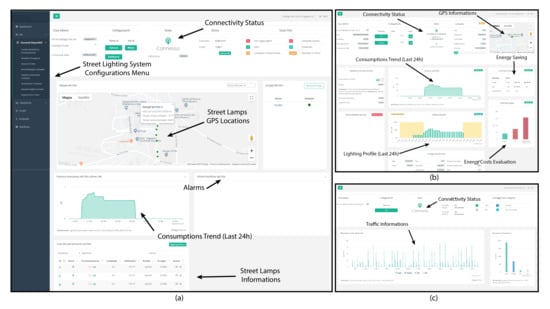 Figure 6 shows some illustrative pages of the web platform. In particular the street lighting remote management page is depicted Figure 6a where the user can operate in order to set the operating modes and configure the street poles operations. Moreover, information about street pole locations (via GPS data displayed on street maps) and status, lighting system consumption trends and fault alarms are displayed in this page. On the other hand, in Figure 6b is reported the pole management: this page shows information related to consumption trends, GPS information, lighting profile, energy costs evaluation and the energy saving granted by the smart system with respect to a traditional (e.g., classic sodium vapor street lights) or LED street lamps system. Finally, Figure 6c shows the traffic monitoring web page.