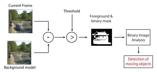 The first step is an image processing task, in charge of converting the raw input video into a format that can be easily processed by the successive steps. Typically during this task, the RGB (Red-Green-Blue) image is converted into a gray-scale one. The second task is the background modeling process that uses the first frame or previous frames to build up a background model [28]. The foreground detection and binary mask creation process compares the input video frame with the background model and identifies candidate foreground pixels from the input frame [29]. A threshold logic is then used to convert the gray scale image into a binary mask, so that the objects of interest are separated from the background.