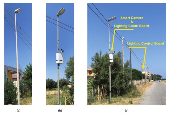 Experimentation site n.2: standard pole (a), smart pole (b) and smart lighting system (c) configurations.
