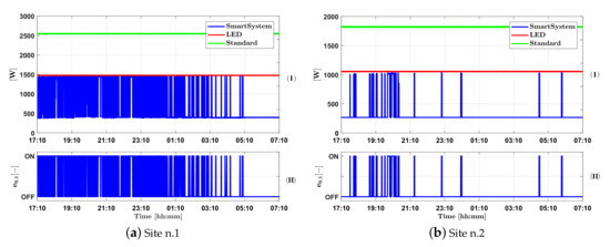 The experimental activity, started in October 2018 and still ongoing, has been useful to compare the consumption of our smart lighting system with the respect to both traditional and LED-based systems. Figure 11 shows consumption comparison among the compared technologies for both the considered demonstration sites. Hence, the upper sub-figures of Figure 11a,b report the instant power trend from 17:10 h to 07:10 h whilst the lower sub-figures show the ”motion detected” event trend. From these Figures it can be observed that when the ”motion detected” event () is OFF the instant power of the Smart System is at minimum value (≈480 [W] for site n.1 and ≈320 [W] for site n.2). On the other hand, if a vehicle or a pedestrian is detected (i.e., the ”motion detected” event is ON) the instant power of the Smart System is at maximum value (≈1500 [W] for site n.1 and ≈1080 [W] for site n.2). It is important to note that these figures report, for a better view, data only from 17:10 h to 07:10 h.