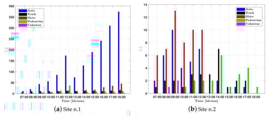 Figure 14 reports the daily average traffic trend for both experimentation sites. The graph reports the traffic detected during daylight hours (from 07:00 h to 18:00 h—day time working mode). As expected, the traffic intensity in Site n.1 resulted in much larger traffic intensity than that in Site n.2. Table 6 reports the averaged annual traffic intensity and the classification results of the moving objects detected in both experimentation sites. The results show how the detection and classification procedure ensures good performance because there is a low percentage of ‘false detection’ that the system classifies as Unknown moving objects.
