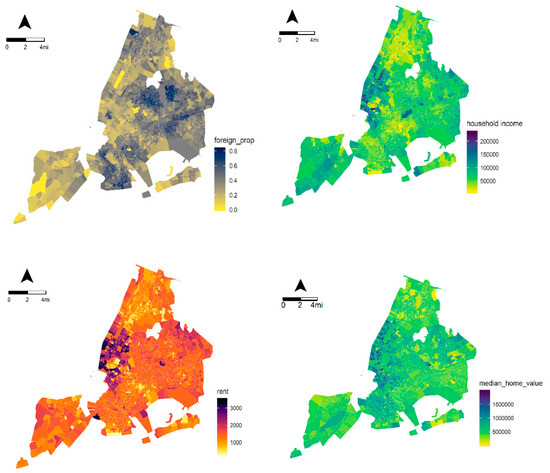 Maps that convey characteristics of demographics and housing in New York City (left top: the proportion of foreign-born residents; right top: median household income; left bottom: median rent; right bottom: median home value).