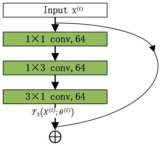 According to residual networks [33], this study builds a residual unit from every three stacked convolution layers with asymmetric kernels (e.g., 1 × 3 and 3 × 1 kernels), to use fewer parameters while still increasing expression ability, as shown in Figure 5.
