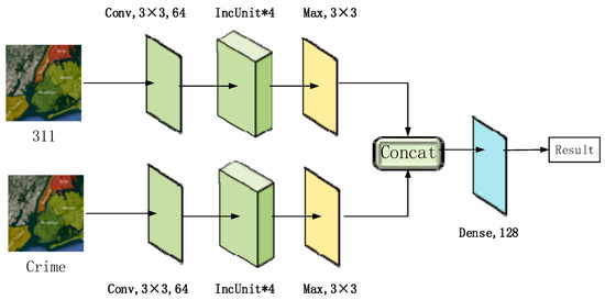 Figure 3 presents an overview of the proposed DIRNet architecture, which is composed of three functional modules handling the crime dataset and the 311 dataset as well as the fusion of these two datasets. The top left branch of DIRNet is responsible for building latent representations using inception units (IncUnits) for crime data. Similarly, the lower-left branch is used to extract 311 spatiotemporal dependencies. Both outputs are fed into the sub-module, which mainly consists of nine residual units (ResUnits) to capture the high-level interactions of crime and 311 events. Finally, the networks end with a global average pooling layer and a two-way dense layer with a Softmax function to realize crime prediction.