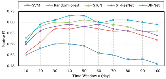 In this experiment, the size of the spatial neighbor set was fixed at 3 × 3. The predictive results of models with a positive F1 and an increasing time window n have been depicted in Figure 7. The horizontal axis of Figure 7 indicates the amounts of days that we take into considerations when we train the model. For example, if n = 10, it means we use the last 10 days’ crime data and 311 data to train the model. Every time the time window is changed, the model has to be retrained. In this test, we have 10 time windows. Hence, we trained the model 10 times. The vertical axis of Figure 7 indicates the F1 score. As the time window increases, more and more crime samples that occurred during the increased window are included in training the models. Figure 7 shows that the proposed DIRNet approach outperforms other baseline models across various time windows. This suggests that the DIRNet model is capable of retrieving the spatial pattern that underlies both short-time span geographical data and long-time span geographical data. More specifically, there is more than a 2% improvement in F1 in comparison with STCN, which is the best classifier among the baseline models. Since the SPPT method always analyzes crime events over an entire area to yield a prediction, its F1 value is constant and the prediction data are the least reliable. For most algorithms, prediction performance improves as the time window increases to a certain threshold, due to more temporal patterns or trends being discovered as more historical crimes and 311 data continue to be fed into models. It is worth noting that the F1 of DIRNet is still higher than all baselines when the length of the time window reaches 100 days, proving that the proposed model has the best ability to reveal distant temporal dependencies from sparse data.
