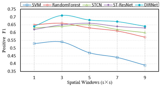 The influence of varying spatial ranges (size of the neighbor set) on the positive F1 is shown in Figure 8. Here, the length of the time window is fixed at 60 days for all models. The horizontal axis of the figure indicates spatial windows while the vertical axis demonstrates F1 scores. As shown in Figure 8, the proposed DIRNet approach achieves the highest F1 score among all the other models, most of which obtain the lower F1 by 6% compared to the DIRNet. This suggests the DIRNet model is more able to capture information of spatial dependency than other models across various spatial windows. The SPPT method offers the worst performance. When the spatial size ranges from 1 to 3, most models experience a performance promotion in F1, demonstrating that the composition of adjacent regions is important for capturing complicated spatial patterns. However, as the spatial range continues to increase, the performance of each of the overall models degrades. The reasons for this may be that crime and 311 intensities in a broader spatial range tend to fluctuate more and have a less significant spatial dependency on a daily temporal scale.