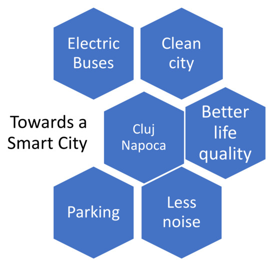 In Romania, the trend of promoting smart cities finds acceptance. A city with an impressive development in this direction is Cluj-Napoca. It has built a public transportation system based on clean vehicles, such as electric buses, and is supported by technology in order to provide information to the inhabitants of the city. It tries as well to reduce noise pollution and to provide smart parking for its inhabitants. Its main features are represented in Figure 3.