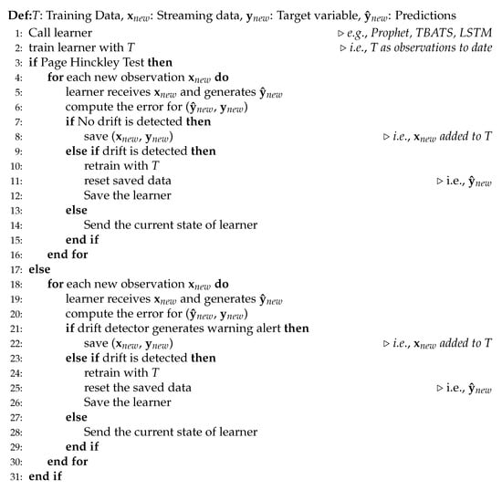 Figure 1. Concept drift adaptation algorithm, modified from [55]. - Implement time series prediction models integrated with concept drift detection to real-world datasets (refer to item 4);
