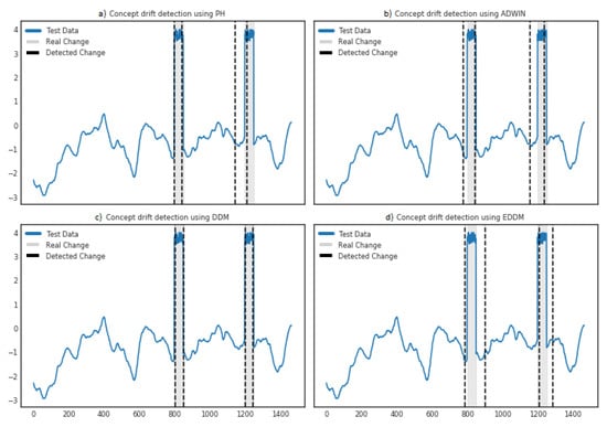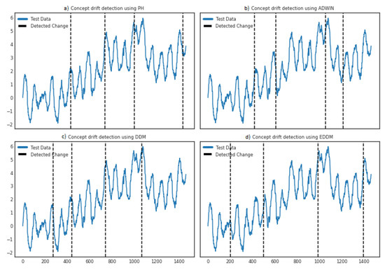 Abrupt drift detection. Gaussian Proccess with Matern Kernel 3/2 was used to synthesize a dataset to experiment with abrupt drift [71]. The data stream is induced with drift at two different sample ranges—from sample 799 to 850; and from sample 1199 to 1250, see Figure 3. All four implemented concept drift detection algorithms are supplied with this synthetic time series as a data stream. The following settings are used after performing preliminary tests: the minimum number of instances passed to each method is n = 100, = 0.005, threshold for detection ( = 1), forgetting factor ( = 1–0.0001) for the PHT. The parameters for ADWIN are set with = 0.005 and use fixed window setting within the range where drift is expected. For DDM, warning level is set to w = 0.9 and drift control level t = 1, whereas for EDDM and are set to 0.9 and 1 respectively. For ADWIN, we first scale the data and then take out the sample indices to be plotted on actual data. The results, illustrated in Figure 3, show that most of the algorithms were able to detect the induced drift in the first sample range. However, the ADWIN and DDM performed better in detecting the drift occurring later, between 1199–1250 sample values. Based on the results retrieved, we verify the correct implementation of drift detection algorithms in distributed environment using Apache Spark.