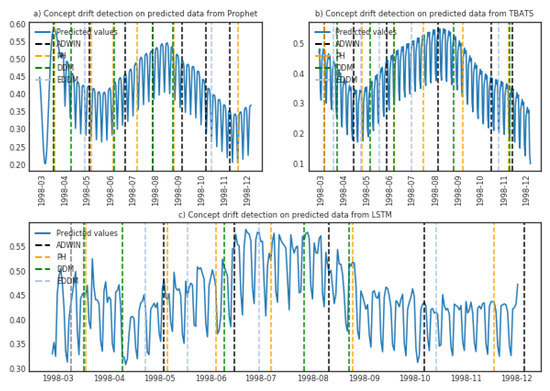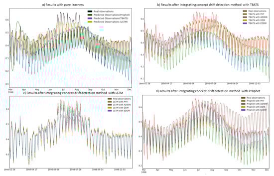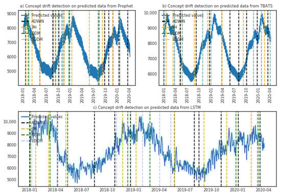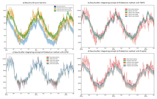 Performance results of learners with integrated concept drift adaptation are provided in Table 2 (“with METHOD_ACRONYM” rows) and Figure 5 and Figure 6. First observation is that some learners, enhanced with the drift detection algorithms, indeed have better performance in terms of mean absolute percentage error and in many cases comply better with the data (e.g., compare Figure 6a,d), when compared to their “pure” versions. However, in several cases integration of concept drift resulted in unsatisfactory MAPE and compliance to real data, when compared to pure learners (e.g., compare Figure 5a,b TBATS with EDDM; compare Figure 5a,d Prophet with ADWIN). The reason of such behaviour could be static parameters of the learner, which require tuning with newly arriving data. In such case, techniques for dynamic tuning of learner’s parameters could be utilised, along with suitability check of certain method for the learner.