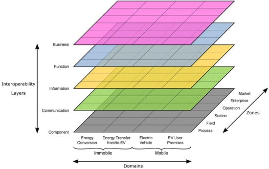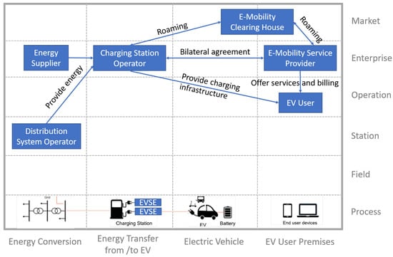 In [], the electric mobility system architecture (EMSA) model and framework were introduced. Such a framework is based on the smart grid architecture model (SGAM) []; however for the context of electric mobility. Thus, its four domains were selected carefully to represent the corresponding cyber physical system (see Figure 1): energy conversion (e.g., DSO), energy transfer to and from EV (e.g., CSO), electric vehicle and EV user premises (e.g., eMSP and EV users). In addition to its four domains, EMSA also consists of–like SGAM–6 zones of process, field, station, operation, enterprise and market. Process is the smallest power generating or consuming entity (e.g., EVSE, EV), whereas field is the concatenation of one or more processes (e.g., charging box providing two or more charging connectors or EVSEs). Station is the aggregation of one or more fields (e.g., a charging station consisting of several charging boxes), whereas operation, enterprise and market are the respective concatenations of lower level entities (e.g., an operation zone can present the aggregation of one or more charging stations). It is worthwhile to mention that starting from operation upwards, the realisation of each zone is done through a software implementation (e.g., charging station management system). Finally, such a model has 5 interoperability layers of business, function, information, communication and component. In business layer, all the actors together with their business goals and high level uses cases are specified. In the function layer, all the necessary functions/methods are defined for the realisation of the goals specified in the business layer. In the information layer, the necessary data models are detailed which are used by the functions specified in the function layer. Communication layer specifies the different communication protocols used for the exchange of information between different functions. The physical infrastructure with its constituent entities are detailed in the component layer.