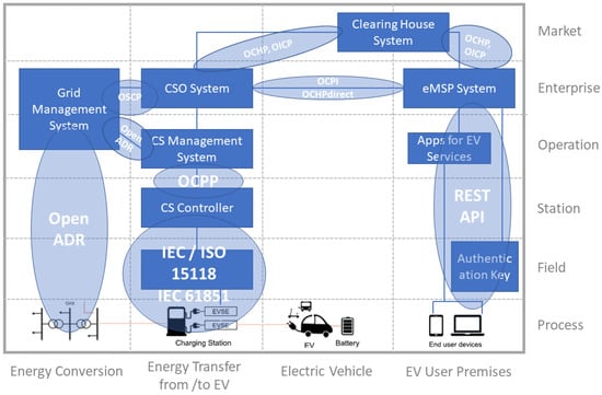 In the zones of operation, station, field and process, the open charge point protocol (OCPP []) is used for the information exchange between the charging station management system (e.g., back-end system) and the charging station controllers giving access to the EVSEs. For the cross-domain information exchange with grid management system, open automated demand-response (OpenADR []) is available. This data model is used for the realisation of demand-response such that the relevant information is exchanged with charging station management system and the grid infrastructure through monitoring devices (e.g., smart meters). Finally, the direct communication between the actors of EV and EVSE as well as between the charging station controller and different charging boxes (e.g., collection of EVSEs) are realised thanks to the standards ISO 15118 [] and IEC 61851 [].