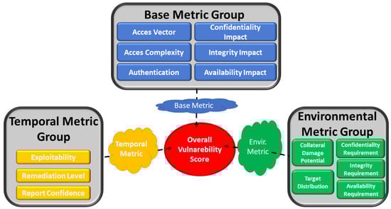 CVSS assesses the vulnerability of a system by dividing the considered metrics into three groups: base, temporal, and environmental (see Figure 4). Base group consists of metrics related to CIA (Confidentiality, Integrity and Availability) impact, access vector and complexity as well as authentication. Temporal group comprises of metrics related to exploitability, remediation level and report confidence. Finally, environmental group consists of metrics related to CIA requirement, potential of collateral damage and target distribution.