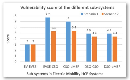 Figure 5 summarises the results of the carried out vulnerability analysis of each pair of communicating sub-systems, by considering the above-mentioned two scenarios. It can be noticed that for the considered both scenarios, the communicating pairs of EVSE-CSO and CSO-eMSP sub-systems are the most vulnerable than the remaining ones. More precisely, by considering Scenario 1, both of the sub-systems EVSE-CSO and CSO-eMSP have high vulnerabilities, DSO-CSO and DSO-eMSP have medium vulnerabilities, whereas the sub-system EV-EVSE has the lowest vulnerabilities. This is also the case, when considering Scenario 2, where DSO-CSO has the lowest vulnerabilities, whereas the other sub-systems have medium vulnerabilities.