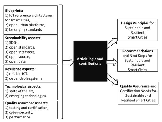 The overall structure of the paper and its contributions is provided in Figure 1 with the concept inputs on the left and derived results for the smart city community and interested stakeholders on the right. The approach is to take various aspects from current theoretical smart city frameworks as an input, including blueprints for ICT reference architectures and belonging standards, various views and dimensions of the sustainability topic, theoretical foundations from the domain of dependable ICT systems, state-of-the-art and emerging technologies as well as theoretical artifacts from the area of quality assurance and testing for communication-based systems. All these inputs are combined within the paper as to provide an overall approach for a resilient and sustainable ICT-based smart city. This resilient and sustainable smart city should build on three main pillars in our view, which are depicted as the papers’ theoretical output on the right side in Figure 1, namely: the design principles for developing sustainable and resilient ICT for smart cities, concrete recommendations for next steps on technological and organizational level, as well as the concept for continuous quality assurance and certification processes for the establishment of high quality and secure critical IT and data communication infrastructures within an urban environment.