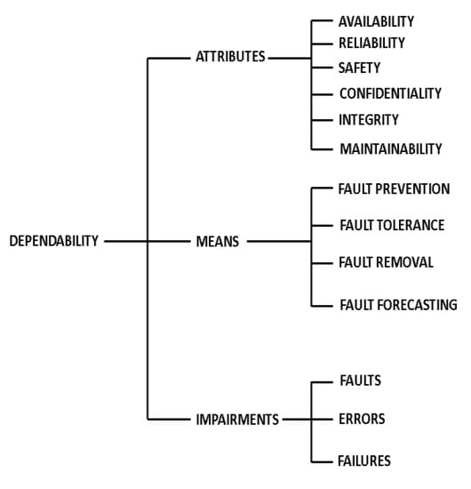 - Randell, B. Dependability-a unifying concept. In Proceedings of the Computer Security, Dependability, and Assurance: From Needs to Solutions (Cat. No.98EX358), York, UK, 7–9 July 1998; IEEE: Piscataway, NJ, USA, 1998; pp. 16–25. [Google Scholar]