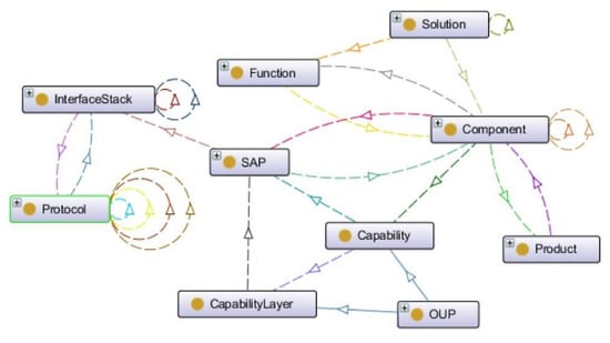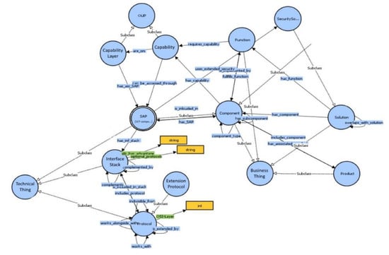 oupPLUS provides a meta-model for the ICT infrastructure in a city, in order to structure the quality assurance for an urban ICT (see Figure 6). It can be used to describe different potential components and solutions by assigning them to different layers/pillar as well as belonging SAPs and concrete interface/protocol stacks as described in Section 6. Furthermore, a component/solution/product should only be accepted (and deployed) when it adheres to the principles defined in the relevant OUP standards, such as the utilization of open interfaces based on open standards. Figure 6 contains an excerpt of an oupPLUS ontology for the purpose of describing smart city solutions, components and overall ICT eco-systems based on principles of oupPLUS. In Figure 6, we see all artifacts from Figure 5 including the OUP layers, the capability maps for a solution/component, the SAPs from oupPLUS as well as the abstract interface/protocol stacks for communication over an SAP, as described in Section 6 and exemplified with concrete instances in Table 1. Hence, Figure 6 provides the basic artifacts which are required in order to start cataloguing and describing urban ICT infrastructures in addition to the illustrations in Figure 7. These illustrations provide on one hand a more elaborated description of the technical aspects (SAPs, interface/protocol stacks, etc.) whilst at the same time showing the relation to a business perspective including the notion of product and further business views when designing an urban ICT. These extensions and integrational aspects were developed in collaboration with a German smart city portal for creating a supply/demand business community for smart city solutions. Therefore, the oupPLUS meta-model descriptions support the conceptual integration or orchestration of organizational, governmental or business perspectives, which is typically required for a smart city.