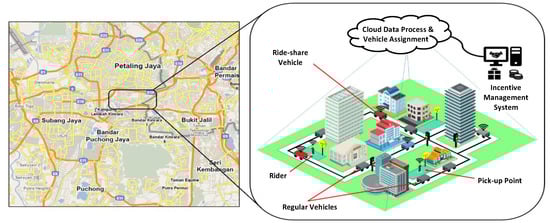 In the last couple of decades, private cars have become a dominant form of transportation for the people who live in urban areas. For example, private car occupancy rates in Europe range from 1.1 to 1.8 for travelers []. Similar private car occupancy rates are found in the United States []. The increasing number of private cars causes serious traffic congestion, extra energy consumption, and emissions. The traffic congestion is further escalated when private cars are used with only with a single rider. Particularly, the urban areas are highly susceptible to traffic congestion during peak hours. The annual cost of traffic congestion in 471 urban areas in the U.S. in terms of extra travel time and fuel are estimated to be approximately 160 billion USD in 2015 []. Furthermore, transportation contributes about 29% of the total U.S. greenhouse gas (GHG) emissions, which considerably affects environmental sustainability []. In Europe, traffic congestion costs 0.5% of the community GDP, and it is predicted that by 2050, the congestion cost will be increased by 50% []. Even in Asia, traffic congestion and GHG emissions have become a severe problem. The total carbon dioxide (CO) emissions from transportation in Kuala Lumpur, Malaysia, reached a substantial 6112 tons in 2015 []. Aside from traffic congestion and emissions, the surplus vehicles cause other problems, such as the necessity for infrastructure maintenance and the requirement of parking spaces. Due to the limited available space in most cities, it is impractical to construct new roads and infrastructures to mitigate traffic congestion. Hence, reducing traffic congestion and GHG emissions has become a critical concern for both transport researchers and policymakers.