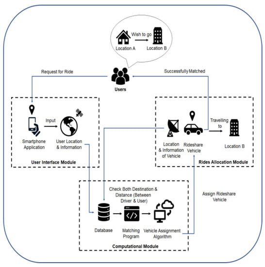 The system architecture of the proposed ride-sharing system is shown in Figure 2. The ride-sharing system operation starts at the user level, followed by the user interface module, then the computational module, and finally the module for allocation of riders. The user interface module allows users to request rides using the smart phone application that we have developed, while the module collects all necessary information including the location and destination of the riders. After collecting all the necessary information, they are sent to the computation module. The computational module receives data both from the user interface module and from the allocation module for rides and store the information in a database. The data are then used in a ride matching program.
