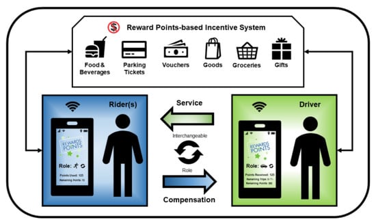 Today, there are a few companies across the world, e.g., GrabTaxi Holdings Pte. Ltd. (Singapore), and Uber Technologies Inc. (San Francisco, CA, USA), that provide ride-sharing transportation services via peer-to-peer (P2P) mobile networking enhanced by smart phones. However, it is observed that the ride-sharing services offered by them do not contribute to mitigating traffic congestion, and in reality, they sometimes aggravate traffic situations further in urban areas []. According to the corporate agenda or original business proposal of these companies, the mitigation of traffic congestion is not their main concern, but instead, they have indirectly created more jobs and income generating opportunities, and consequently, increased the number of vehicles on road networks. Therefore, a new mode of comprehensive transport system needs to be introduced in order to reduce future road traffic congestion in urban road networks.