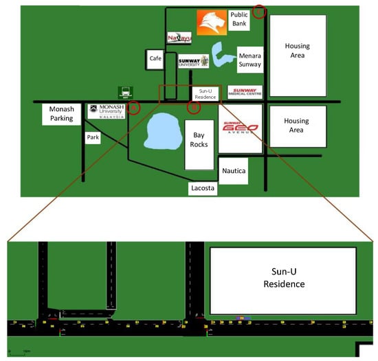 A model of the multi-lane traffic network of Sunway City is built in SUMO. The traffic network consists of eight junctions, six of them having signalized intersections. The traffic flow in the network is varied from moderate to congested, imitating the real traffic scenario of the city. The duration of traffic signals is set similar for every signalized intersection in each direction, e.g., 30 s for green, 3 s for yellow, and 60 s for red. We only consider gasoline driven passenger cars with Euro norm 4 and Krauss microscopic car-following model in the simulation []. The Krauss model is based on the safe speed and is computed as