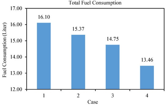 Figure 6 shows the simulation results of total fuel consumption of passenger cars in four different cases. It is found that the total fuel consumption of the traditional transportation system without ride-sharing (case 1) is 16.10 L, which is the maximum, and the consumption reduces significantly when the percentage of passengers using the ride-sharing system increases. The total fuel consumption of the ride-sharing system for case 2, case 3, and case 4 with varying percentage of drivers and riders are obtained as 15.37 L, 14.75 L, and 13.46 L, respectively. Hence, in case 2, the total fuel consumption is reduced by 4.53% when only 2.5% riders out of 20% ride-sharing users are using the ride-sharing service, whereas in case 3, the fuel consumption is reduced by 8.38% when 5% riders are using the ride-sharing service. In the best case (case 4) when 10% riders (out of 20% users) are using the ride-sharing system, the total fuel consumption is reduced by 16.40% compared to the traditional transportation system without ride-sharing.