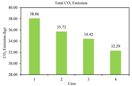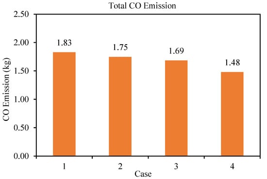 Figure 7 and Figure 8, respectively, illustrate the total CO and CO emissions of the cars in four different cases. We find that the total CO emission of the traditional transportation system without ride-sharing (case 1) is 38.06 kg, whereas the total CO emission of the ride-sharing system for case 2, case 3, and case 4 are 35.72 kg, 34.42 kg, and 32.29 kg, respectively. Hence, the proposed ride-sharing system reduces the CO emission by 6.15%, 9.56%, and 15.16% for case 2, case 3, and case 4, respectively. On the other hand, the total CO emission for case 1, case 2, case 3, and case 4 are 1.83 kg, 1.75 kg, 1.69 kg, and 1.48 kg, which, respectively, resulted in the reduction of total CO emissions by 4.37%, 7.65%, and 19.13%. Thus, the results show significant economical and environmental benefits of the proposed dynamic ride-sharing system. The summary of the simulation results of fuel consumption, CO and CO emissions for four different cases are given in Table 3.