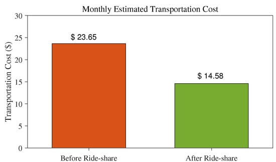 Now, the question arises if an individual might be interested to use the incentive (point rewards) based ride-sharing system. Hence, we have evaluated the potential savings from the proposed system for a single user, who resides in a city and regularly travels to work using their private car. As an example, the comparison of monthly estimated transportation cost before and after using the ride-sharing system is illustrated in Figure 9 and the detail calculation is provided in the Appendix A.