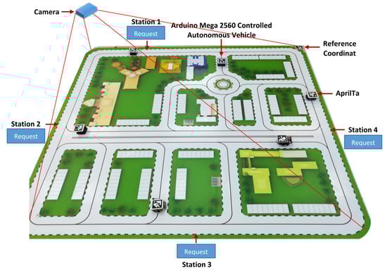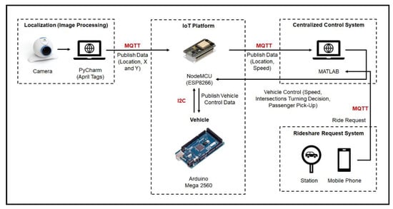 In addition, a reference coordinate is set using an AprilTag in the top right corner of the city map. The reference point facilitates the calculation of location and distance of vehicles as well as preventing any change of the coordinate of any vehicle. To capture the tag images, a camera is installed directly on top of the city model. The captured images are then processed to track the position of the vehicles. For each autonomous vehicle, a unique tag is used with a unique ID. The pick-up station is equipped with an LCD powered by another NodeMCU displaying the ride-sharing status including the approaching ride-share vehicle and the passenger status. The dynamic behavior of vehicles is implemented using the microscopic car-following model. The overall process flow of prototype implementation is illustrated in Figure 11.