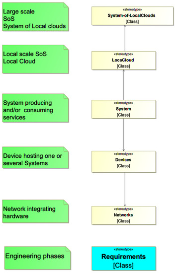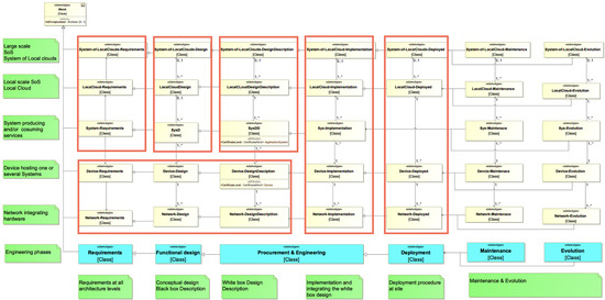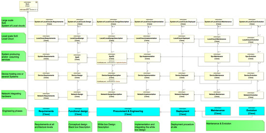The engineering process, on one hand, and the architecture based on Eclipse Arrowhead, on the other hand, have been used to form a two-dimensional matrix approach to the engineering of complex SoS SOA-based smart city solutions; see Figure 4. The matrix has been captured in a SysML profile [31]. In addition, most of the Eclipse Arrowhead core SOA systems have been modelled and made available as a library, along with a number of templates for often-used constructs. The SysML profile, library, and templates are available at www.github.com/eclipse-arrowhead/profile-library-SysML (accessed on 29 April 2021).