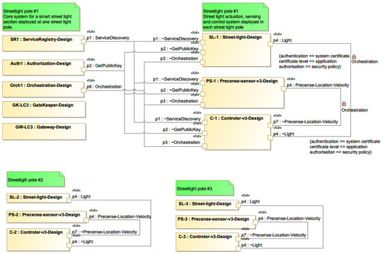A SysML internal block diagram for a small local cloud of smart streetlight poles, including necessary SOA infrastructure support systems, orchestration principles, and service interaction security policies. For simplicity, only 3 streetlights have been modelled. Each streetlight has the capability of sensing the presence of objects for which the light should be turned on. Only one streetlight holds the Eclipse Arrowhead core systems ServiceRegistry, Authorization, and Orchestration, which supports the fundamental SOA principle. With the help of these core systems, more streetlights can be added, and defective ones can be replaced with minimal system integration effort and cost. In addition, interaction with other streetlight sections can be established using the Eclipse Arrowhead Gatekeeper and Gateways core systems [33].