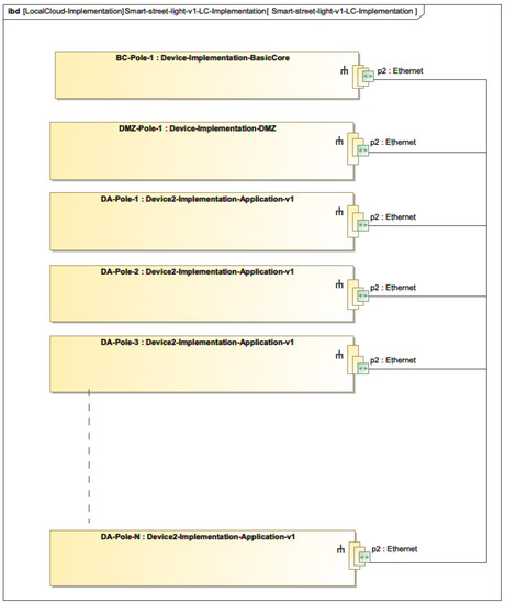 Next, the devices and network are integrated into a local cloud model that describes in which light pole individual hardware and its microsystems are installed. An example is depicted in Figure 10.