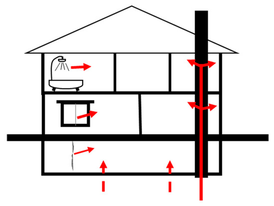 Considering that radon gas is denser than air, the places with the highest probability of accumulation and exposition for human beings are in basements and first floors of buildings where radon penetrates, as represented in Figure 1 (from the outside ground to the inside of the house through the building materials). To reduce radon concentration in a house, manual ventilation is an effective preventive measure. However, there are other solutions that divert the radon path within a building, such as anti-radon foils or mechanical extraction systems (forced ventilation). These latter measures are the most expensive solutions because they involve modification of the building structure [6,7].