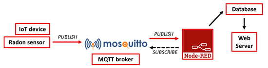 The architecture that defines this technology is divided into three elements: two clients and a server (broker), and the first element corresponds to the client that publishes information and sends it in the form of messages to the other end of the network. The second client is the one who subscribes to a specific topic and receives the previous data, having the possibility of interacting with the first part by sending messages as well. The broker is the element that allows the bidirectional exchange of information between clients and keeps the devices connected to the cloud. That is, clients subscribed to a topic can receive and send messages via a broker. In Figure 5, the clients are related to the radon sensor (which has the information) and Node-RED (which receives the data).