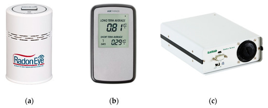 Considering the above, the minimum components that integrate a radon monitoring system are a sensor, a monitoring unit, wires to connect the different elements and a power supply that provides the power consumption for long measurements [11]. At a professional level, a continuous assessment of radon exposure over a period of at least three months is required for reliable results. Indeed, short-term radon tests are mainly intended for domestic use [24].