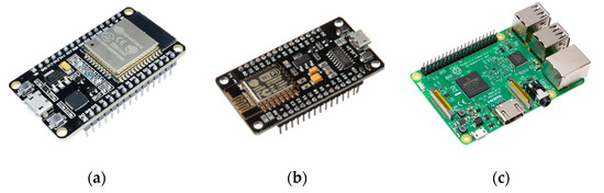 IoT devices: (a) ESP32, (b) ESP8266 and (c) Raspberry Pi.