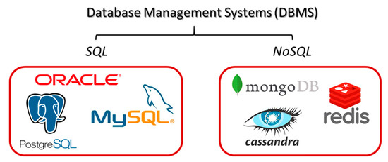 On the other hand, the NoSQL system is applied in databases whose storage does not follow a defined structure and does not use the SQL language to perform queries. Due to their simplicity, these databases are easy to develop and support large volumes of information because they are not divided into smaller entities. In Figure 8, some DBMS have been classified to provide some examples, and they are relational (SQL) or non-relational (NoSQL) databases.
