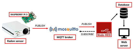 The methodology used to perform the database programming and the website design includes the following steps: data extraction from the radon tester, IoT device programming with MQTT, database design and implementation, data flow management with Node-RED and website integration. Accordingly, the components involved in the proposed architecture for the case study are presented in Figure 9.