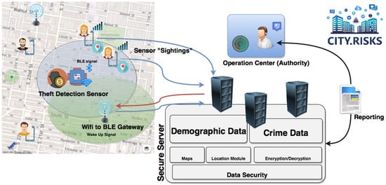 The utilization of beacons offers a reliable, cost effective solution for accomplishing these activities. The BLE tags enjoy a long-lasting battery life and thanks to their small size can be easily placed on or within the assets. For instance, in the case of bicycles, the advanced Bluetooth beacon sensor includes a function that allows commuters and cyclists to locate their bicycles in real-time through a smartphone application or a cloud-based web application. The application leverages information from Bluetooth beacons, which detect the presence of bicycles. City.Risks is based on Machine to Machine (M2M) structure development [,]. The proposed concept is based on four entities, which namely are: