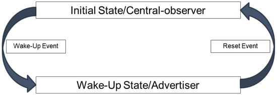 The BLE module runs the appropriate firmware application. Certain developed boards are available, offering integrated environments for developing appropriate firmware applications [,,]. BLE should start in central-scanner mode. Whenever a certain advertisement packet is scanned, the device switches to peripheral-advertiser mode. The device can return to the initial state by a reset signal from the owner’s mobile. BLE tag device modes are graphically presented in Figure 4.