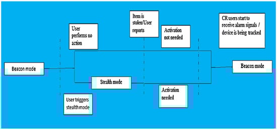 When the user leaves his/her personal items in a place that is considered to be unsafe he/she can optionally set the device in “stealth mode”. This is a mode that can receive wake-up signals although it cannot be scanned by other devices. If the specific item is stolen, whilst it is in that mode, a wake-up signal is needed in order to set the device in beacon mode again. Either way to track down the device, the beacon mode is necessitated. A flow chart of the working scheme is illustrated in Figure 5.