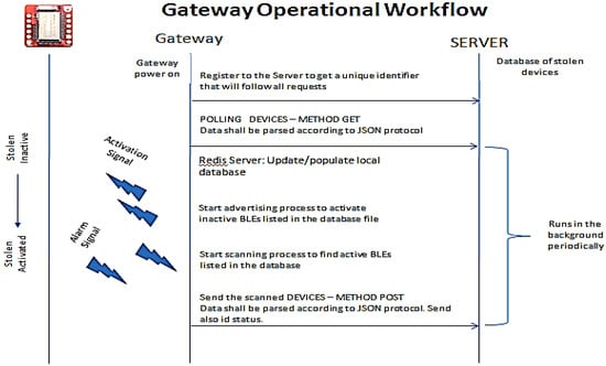 In line with the workflow presented in previous sections, the Gateway requests from the server side the BLE tags that have been reported as being stolen. Then, it updates its local database and accordingly configures the BLE/USB module to either broadcast the appropriate device name to the remote BLE tag or alternatively scan, in order to detect already activated tags. In other words, it actually converts its operational status to peripheral mode and starts broadcasting a signal in order to switch the remote BLE sensor from scanner to peripheral mode. When in scanning mode, the BLE tag sensors that are found are reported back to the server as scanned or traced.