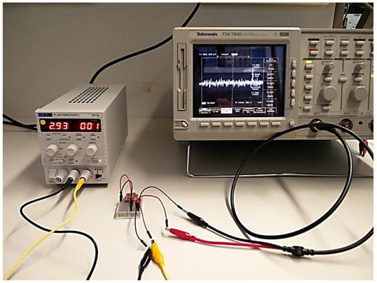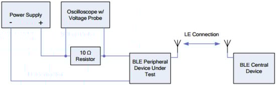 Current consumption during advertising mainly depends on the advertising interval, which is adjusted by modifying the relevant parameter. Practically, in order to save current, t the device should advertise periodically and not continuously. The measurement setup that was used for measuring the current is schematically shown in Figure 16, while the lab devices are depicted in Figure 17 and the measurements diagram is illustrated in Figure 18.