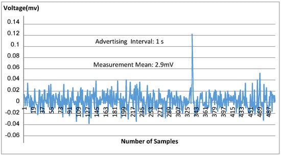 It was found that current consumption was approximately equal to 36 mA, which is quite close to the value found by the device manufacturer [] regarding current consumption in advertising mode with advertising interval 1000 ms, 31 bytes payload, and 4 dBm output power.