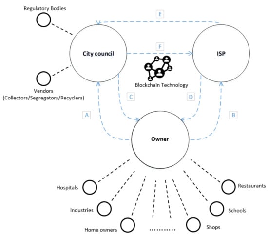 The work presented in this paper is therefore driven by a realization of the beneficiaries and diverse relationships between entities existing in smart cities. Such a scenario realizes the perspective of Ruhlandt (2018) [5] regarding the multifaceted IoT ecosystem complexity, with each player in the ecosystem having their own objective. Specific to SWM, a homeowner might only be concerned about needing to know if their bin needs to be placed in a location for emptying, and not the fact of the waste in their bin being able to be merged with a neighbor’s bin for a more efficient collection process. A city council might only care about ensuring that all bins in a region are collected according to the weekly schedule, regardless of the impact on the environment of doing so. Assuming a potential situation of big data and a cloud management strategy to optimize its organization, an ISP might prioritize the availability of SWM data in their cloud repository by not archiving or deleting, which other customers can use to optimize the service provision in another part of the city, without caring about the efficiencies with which the bins were collected. From this perspective, there are few overlaps between the goals of each entity.