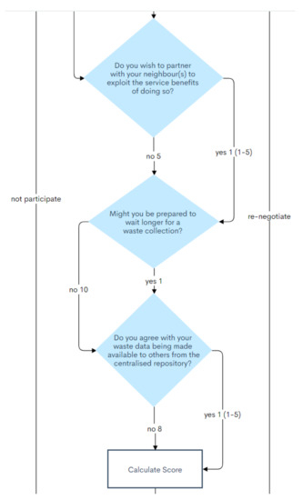 To contextualize how the scoring mechanism is applied when determining a customer’s SLA and their council tax bill (Table 2): A customer who is a non-participant of SWM will pay 100% of their council tax, with a score of 39—this translates to receiving a 0% rebate. Specific to the investigation in this paper, we consider a customer’s tax bill in relation to the various city services that it is responsible for contributing to i.e., fire service, police service, waste service; the discount which we propose in this work is specific to the charges for waste. This score is calculated by adding the scores that are awarded through the flow chart in Figure 3, Figure 4 and Figure 5 when a customer does not agree to participate in any of the SWM options (10 + 5 + 1 + 5 + 10 + 8). An initial score of 10 is awarded for citizens who are not participating, while customers who indicate that they wish to participate are awarded a score of 1. For a citizen who is a full participant of SWM with a score of 14 (1 + 5 + 5 + 1 + 1 + 1), on the other hand, they will receive 100% of the rebate available. Achieving this score will mean that they have agreed to apply all aspects of the SWM scheme and can tolerate a fully flexible service. A customer who wants to participate in the scheme, by way of comparison, but who rejects, at least initially, all options for SWM will achieve a 23% rebate, with a score of 30 (1 + 5 + 1 + 5 + 10 + 8). In this model, we make an assumption that a council will set a maximum rebate available, in line with their costs and savings incurred, and participants of the SWM will earn a proportion of this depending on their activities.