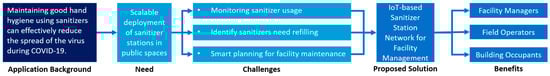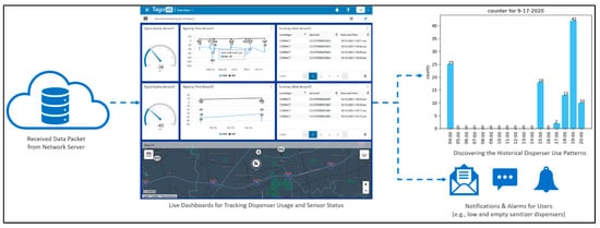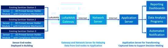 Preventive measures are among the critical strategies for reducing the burden of the COVID-19 pandemic. Following the guidance of the Centers for Disease Control and Prevention (CDC) [1] within the U.S. and that of other health agencies around the world, these prevention measures include mask wearing, maintaining physical distance from others (i.e., “social distancing”), hand hygiene, deep cleaning, and disinfection. Recent studies suggest that preventive measures will continue to be important, particularly in the current context of vaccination efforts [2,3,4]. As one of the essential preventive measures performed at an individual level, maintaining good hand hygiene using alcohol-based sanitizers can effectively reduce the spread of the virus, which warrants the scalable deployment of sanitizer stations in public spaces such as hospitals, shopping malls, office buildings, and university campuses. However, deploying a large number of sanitizer stations throughout a large area and in multiple buildings creates challenges for effective facility management. In particular, sanitizer dispensers should be refilled as soon as they empty so that they are available when needed. In this sense, the facilities operations team should be able to (i) monitor the usage of sanitizer stations; (ii) readily identify the locations and number of sanitizer stations that need refilling; and (iii) generate the schedule and route for maintaining the sanitizer stations accordingly. These requirements demonstrate the need for automated usage tracking of sanitizer stations distributed throughout a large area.