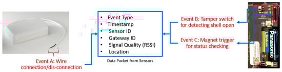 - Multiple triggering mechanisms: the sensor can detect several different events through three different mechanisms, namely, wire connection/disconnection (Event A), tamper switch for detecting sensor shell open (Event B), and magnetic trigger for sensor status checking (Event C).