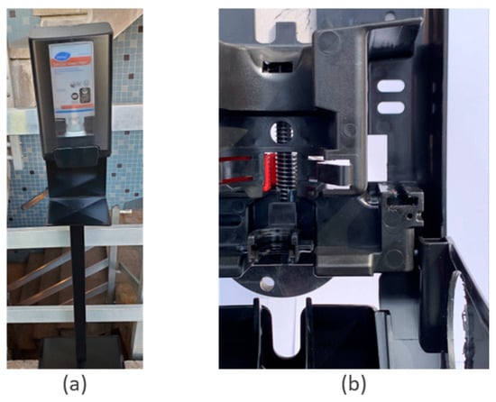 Existing sanitizer station with dispenser bottle (Diversey Intellicare Dispenser II, 1.3 L, 9.1″ × 19.5″ × 11.2″): (a) shows the dispenser with bottle installed as part of the sanitizer station; (b) inside view of the dispenser activation system.